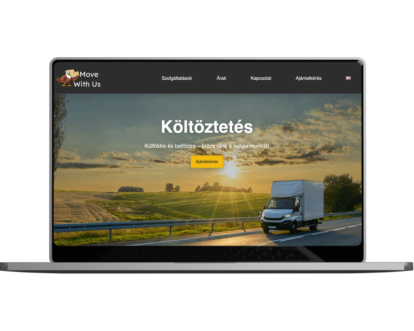 A Move With Us számára készítettem egy modern, két nyelvű weboldalt, mivel a vállalkozás nemcsak belföldön, hanem külföldre is vállal költöztetést. A cél egy olyan online megjelenés kialakítása volt, amely egyszerre bizalmat kelt és könnyen használható mind a hazai, mind a nemzetközi ügyfelek számára.