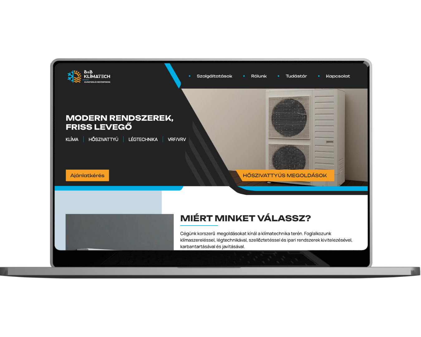 A B&B Klímatech klíma-, hőszivattyú- és légtechnikai rendszerek kivitelezésével, karbantartásával és kereskedelmével foglalkozik. A vállalkozás egy színesebb, professzionális megjelenésű weboldalt szeretett volna, amely tükrözi szakértelmüket és megbízhatóságukat.